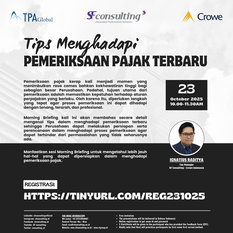 SF CONSULTING TAX FREE MORNING BRIEFING “Tips Menghadapi Pemeriksaan Pajak Terbaru” SF Consulting - Crowe Indonesia Thursday, 23 October 2025 10.00 - 11.30 AM (Jakarta ...
