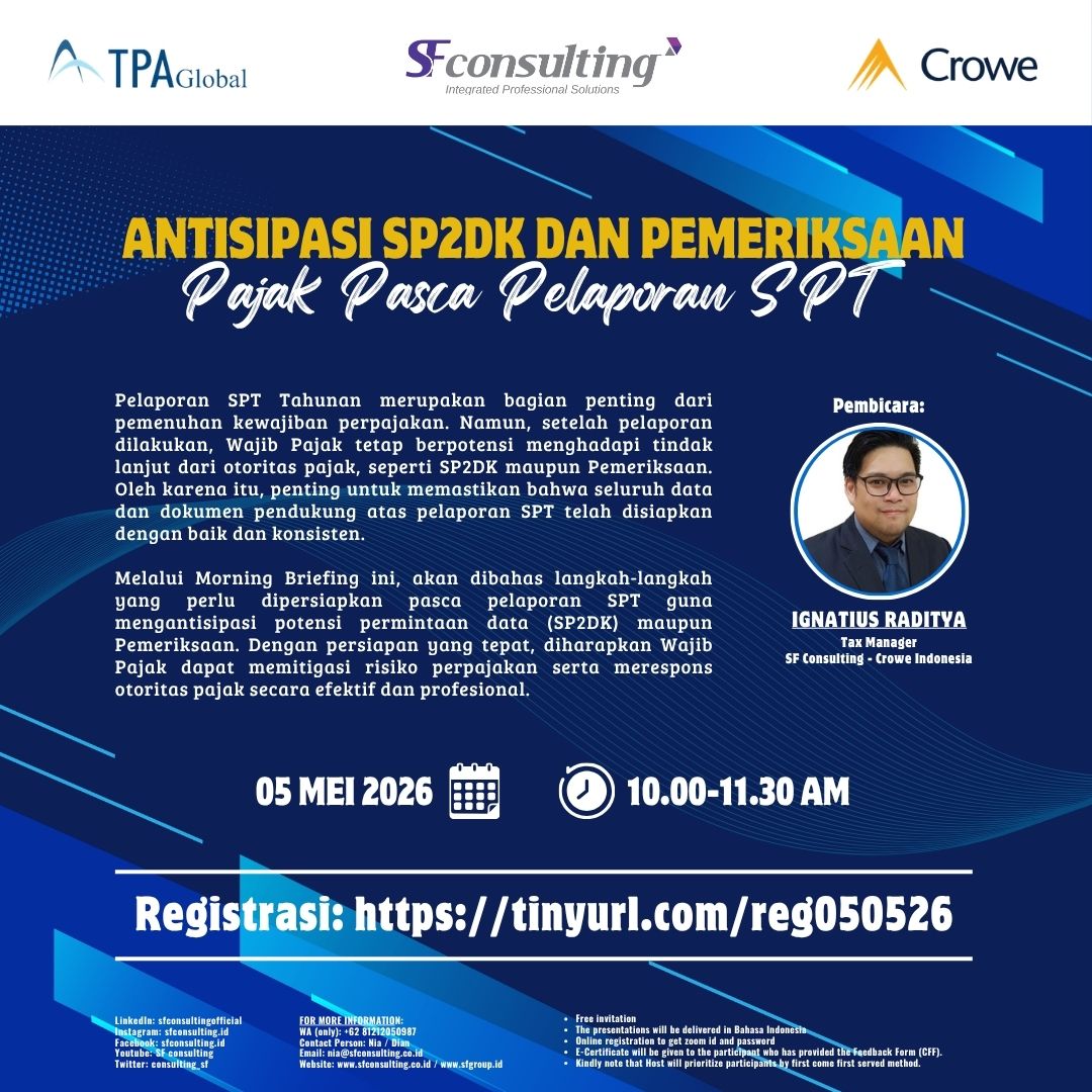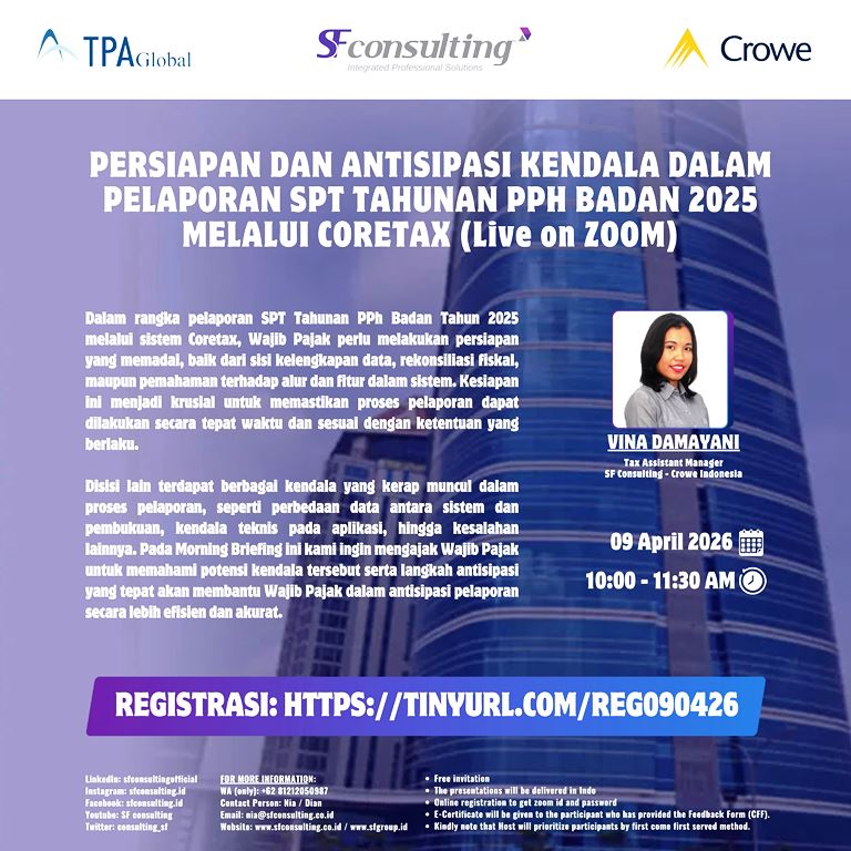 SF CONSULTING TAX FREE MORNING BRIEFING LIVE ON ZOOM SF Consulting - Crowe Indonesia Tuesday, 05 May 2026 10.00 - 11.30 AM (Jakarta Time) Live ...