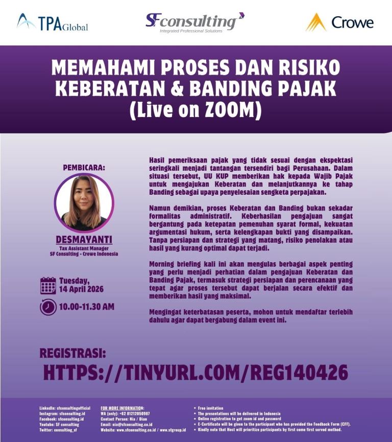 SF CONSULTING TAX FREE MORNING BRIEFING LIVE ON ZOOM SF Consulting - Crowe Indonesia Tuesday, 14 April 2026 10.00 - 11.30 AM (Jakarta Time) Live ...