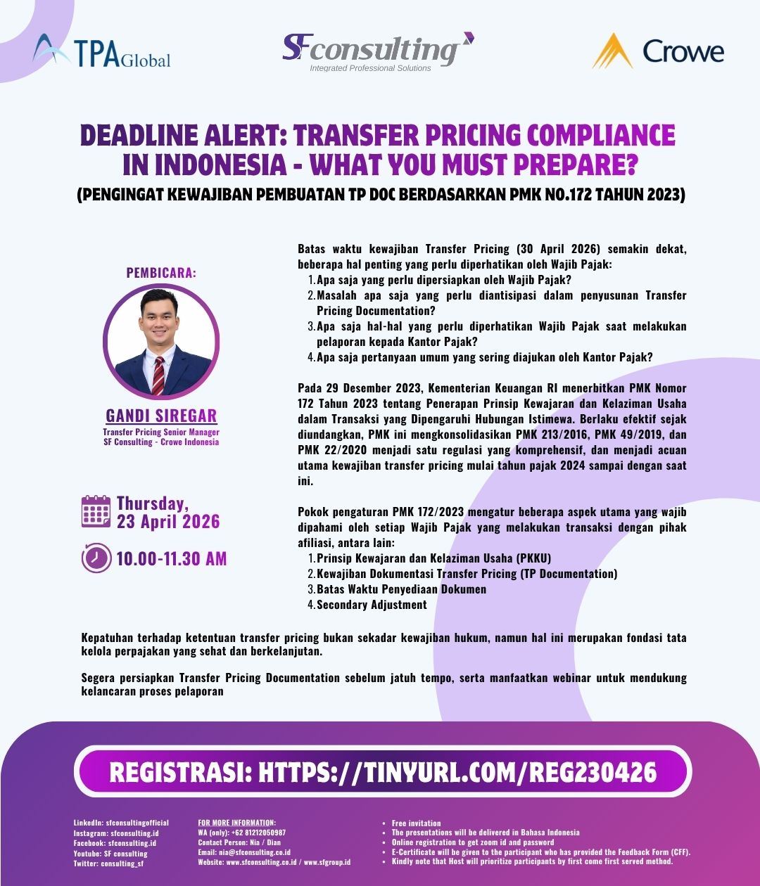 SFc Transfer Pricing Free Morning Briefing 23 April 2026 Thursday, 23 April 2026 10.00 - 11.30 AM (Jakarta Time) Live on ZOOM Registration: https://tinyurl.com/reg230426 ...