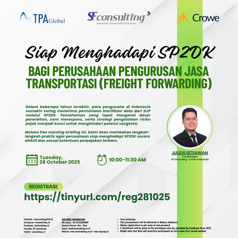 SF CONSULTING TAX FREE MORNING BRIEFING LIVE ON ZOOM “Siap Menghadapi SP2DK bagi Perusahaan Pengurusan Jasa Transportasi” SF Consulting - Crowe Indonesia Tuesday, 28 October ...